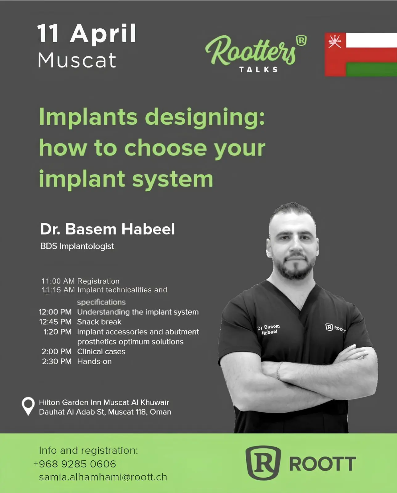 Join us on April 11th at the Hilton Garden Inn, Muscat, for an exclusive, comprehensive seminar on Implant Designing and System Selection, led by esteemed Implantologist Dr. Basem Habeel BDS / IMPLANTOLOGIST