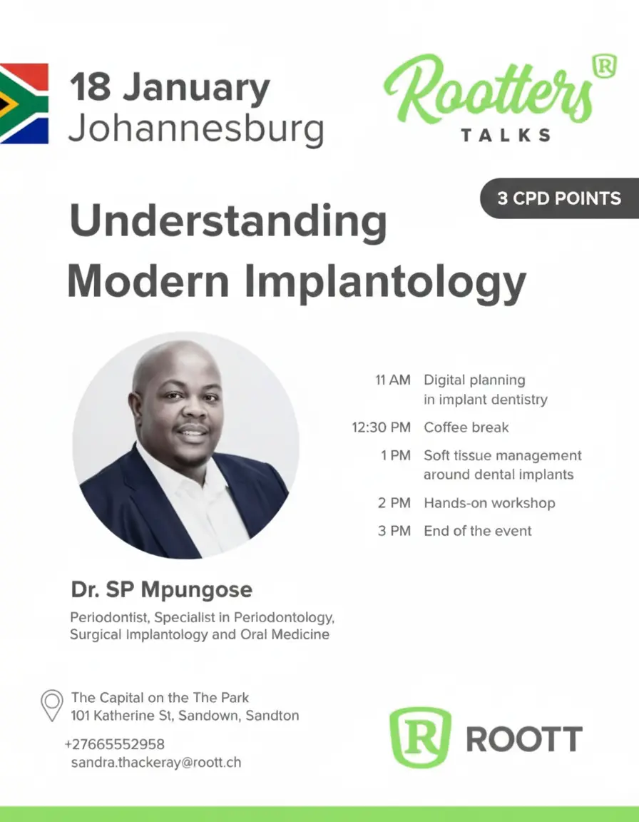 Join Dr. SP Mpungose for an exclusive masterclass on January 18th designed to bridge the gap between digital precision and biological excellence. You will master a start-to-finish digital workflow for planning multiple implant cases, ensuring maximum clinical accuracy and predictability. The session also dives deep into advanced soft tissue management techniques essential for long-term stability and superior "pink" aesthetics. Following the lectures, you will participate in a guided hands-on workshop to apply these surgical and digital skills in a practical, simulated environment. Secure your spot today to learn from a leading specialist and elevate your practice to the next level of excellence.