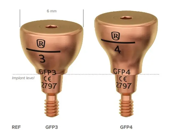 This is a single-component solution featuring a cone-shaped external interface for a passive fit. Its profile is ergonomic, designed to support optimal gum contouring and esthetics. The design is configured to potentially prevent bone growth on the implant shoulder, aiding in crestal bone integrity maintenance.