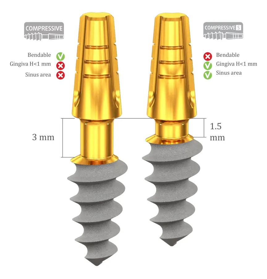 Abutment direction can be bent up to 15∘. The COMPRESSIVE S short neck implant is suitable for the Sinus area and Gingiva height <1 mm.