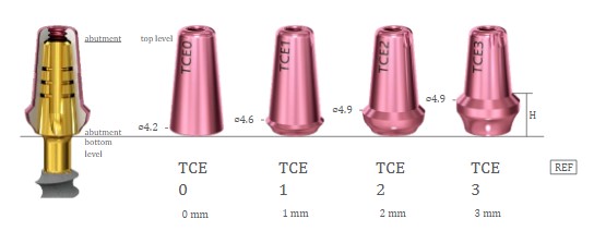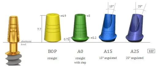 Compatible with various abutment solutions for prosthetic finishing: Telescopic Titanium caps (TCE, TCES, TCEXS) , and Burnout parts (BOP, A0, A15, A25) .